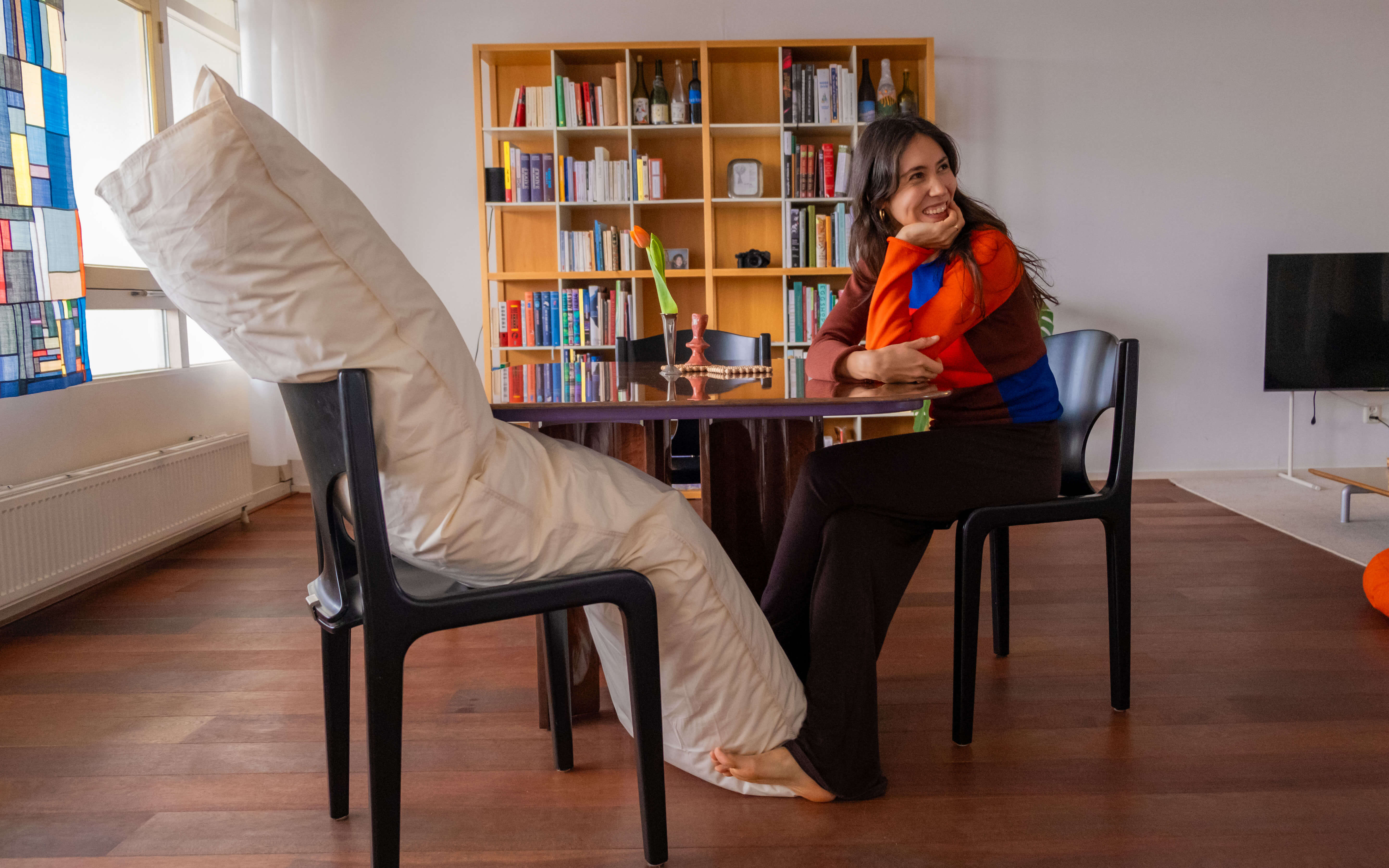 Bij aankomst bij Naiara worden we meteen overdonderd door het uitzicht. Haar woning in Amsterdam-Oost ademt rust; een plek die haar kalme energie perfect weerspiegelt. Net terug van Fonda, vertelt ze. Tijdens de shoot was het nog niet open, inmiddels is het een echte hotspot aan het Museumplein. Fonda Café is te vinden op de eerste verdieping, naast de iconische trap van het gebouw.