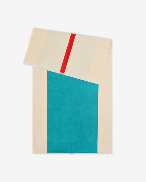 Das red turquoise Badetuch ist 70x140 cm groß, besteht aus wunderbar weicher gekämmter Bio-Baumwolle und wiegt 550g pro Quadratmeter. Durch die dicht gewebte Struktur fühlt sich das Handtuch besonders weich an.