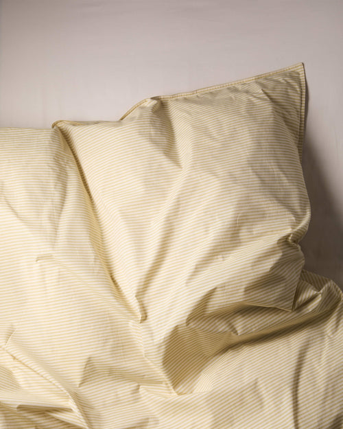 Lemonfarben/ecru gestreifte luxuriöse Bettwäsche aus biologischer Perkal-Baumwolle mit einer Fadendichte von 200. Perkal-Baumwolle ist wunderbar glatt und knackig. Die Streifen sind gewebt: Die Fäden werden zuerst gefärbt und dann gewebt. Dadurch bleiben die Farben länger schön als bei einem Druck. Der Bettbezug hat einen Blindverschluss und keinen Einfassband.