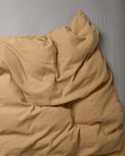 The organic, washed linen bedding is 55% linen and 45% cotton. Duvet cover has a blind closure with buttons without a tuck-in strip. The duvet cover comes without pillowcases, you order these separately in a color of your choice.
