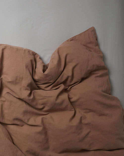 The organic, washed linen bedding is 55% linen and 45% cotton. Duvet cover has a blind closure with buttons without a tuck-in strip. The duvet cover comes without pillowcases, you order these separately in a color of your choice.