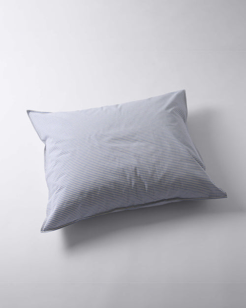 A luxurious blue /ecru striped pillowcase, made of organic percale cotton with a thread count of 200. Percale cotton is crispy and wonderfully smooth. The pillowcase has a flap on the inside, so that the pillow stays in place.