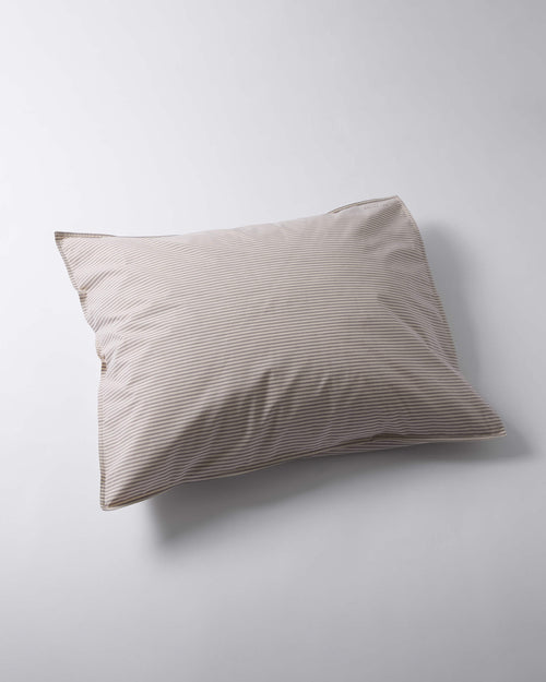 A luxurious brown /ecru striped pillowcase, made of organic percale cotton with a thread count of 200. Percale cotton is crispy and wonderfully smooth. The pillowcase has a flap on the inside, so that the pillow stays in place.