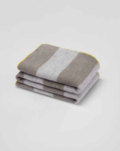 Blanket of 86% New Zealand Merino wool & 14% cotton 130x180 cm. The blanket is double-sided, on one side wide and on the other side narrow stripes. The edge is finished with a Lime Green contour stitching. Due to the Merino wool and cotton it is wonderfully soft and does not itch. Fits perfectly on bed and couch.