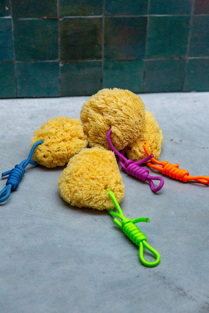 L'éponge naturelle est suspendue à un cordon pratique de couleur vive. Le cordon est fabriqué aux Pays-Bas à partir de PET recyclé.