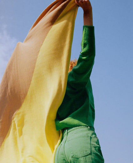 Nos plaids sont en coton double tricot. Le double tricot signifie en fait que ce sont deux plaids qui sont réunis. De ce fait, les plaids n’ont ni recto ni verso. Le plaid est composé à 100 % de coton biologique et est fabriqué en Inde. Tous les plaids sont