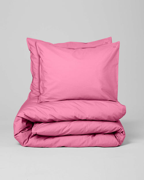 Ce linge de lit de luxe rose vif en percale de coton biologique compte 300 fils au pouce carré. Le coton percale est merveilleusement doux et croustillant. La housse de couette est dotée d'une fermeture invisible à boutons, sans bande de maintien. La parure comprend une housse de couette et une ou deux taies d'oreiller.