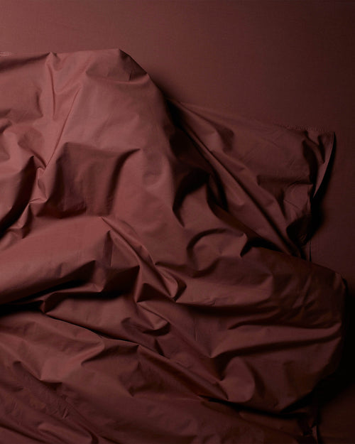 Cette housse de couette rouge foncé de qualité hôtelière de luxe en percale de coton biologique a un nombre de fils de 300. La percale est merveilleusement douce et croustillante comme un lit fraîchement fait. La housse de couette a une fermeture aveugle avec des boutons sans bande de serrage. Vous pouvez commander séparément des taies d'oreiller dans la couleur de votre choix.