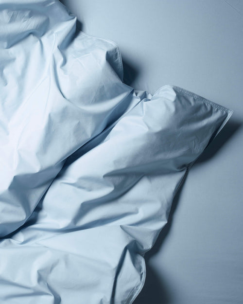Cette housse de couette bleu clair de qualité hôtelière de luxe en percale de coton biologique possède un nombre de fils de 300. La percale est merveilleusement douce et moelleuse, comme un lit fraîchement fait. La housse de couette est dotée d'une fermeture invisible à boutons sans bande de maintien. Vous pouvez commander les taies d'oreiller séparément, dans la couleur de votre choix.