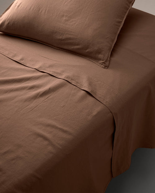 Drap en lin de couleur marron composé de 55% de lin et 45% de coton, respire bien. A une texture tissée mate légèrement plus grossière. Grâce à l'ajout de coton, nos draps en lin sont plus doux que les draps 100% lin.