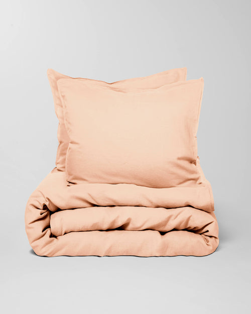 Le lin biologique lavé est composé à 55 % de lin et à 45 % de coton. L'aspect lin robuste, mais merveilleusement doux. La housse de couette a une fermeture aveugle avec des boutons sans bande de serrage. La parure orange se compose d'une housse de couette et est livrée avec deux taies d'oreiller.