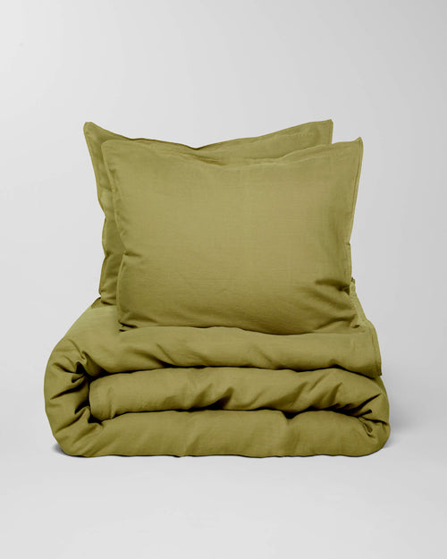 Le lin biologique lavé est composé à 55 % de lin et à 45 % de coton. L'aspect lin robuste, mais merveilleusement doux. La housse de couette a une fermeture aveugle avec des boutons sans bande de serrage. La parure verte se compose d'une housse de couette et est livrée avec deux taies d'oreiller.