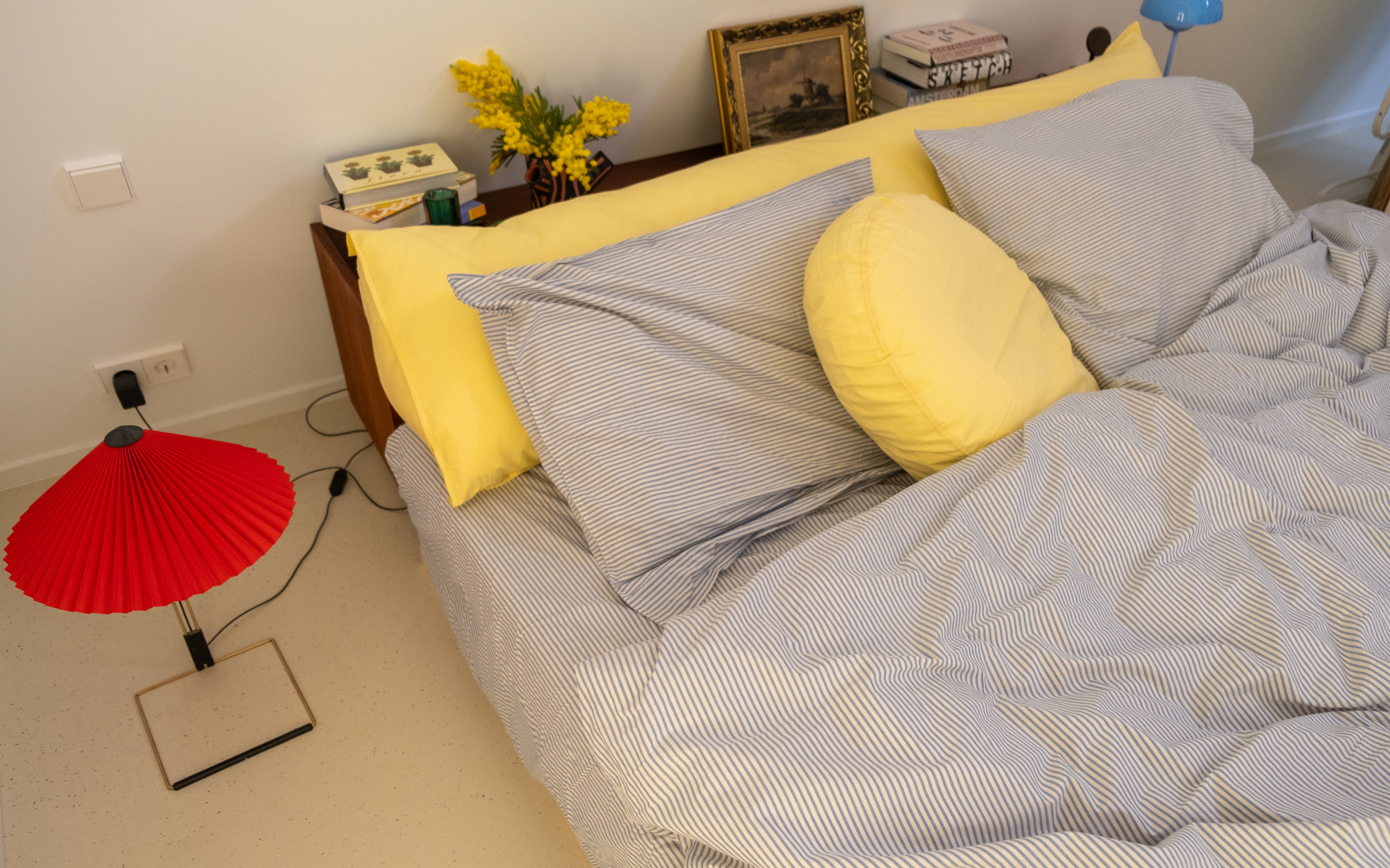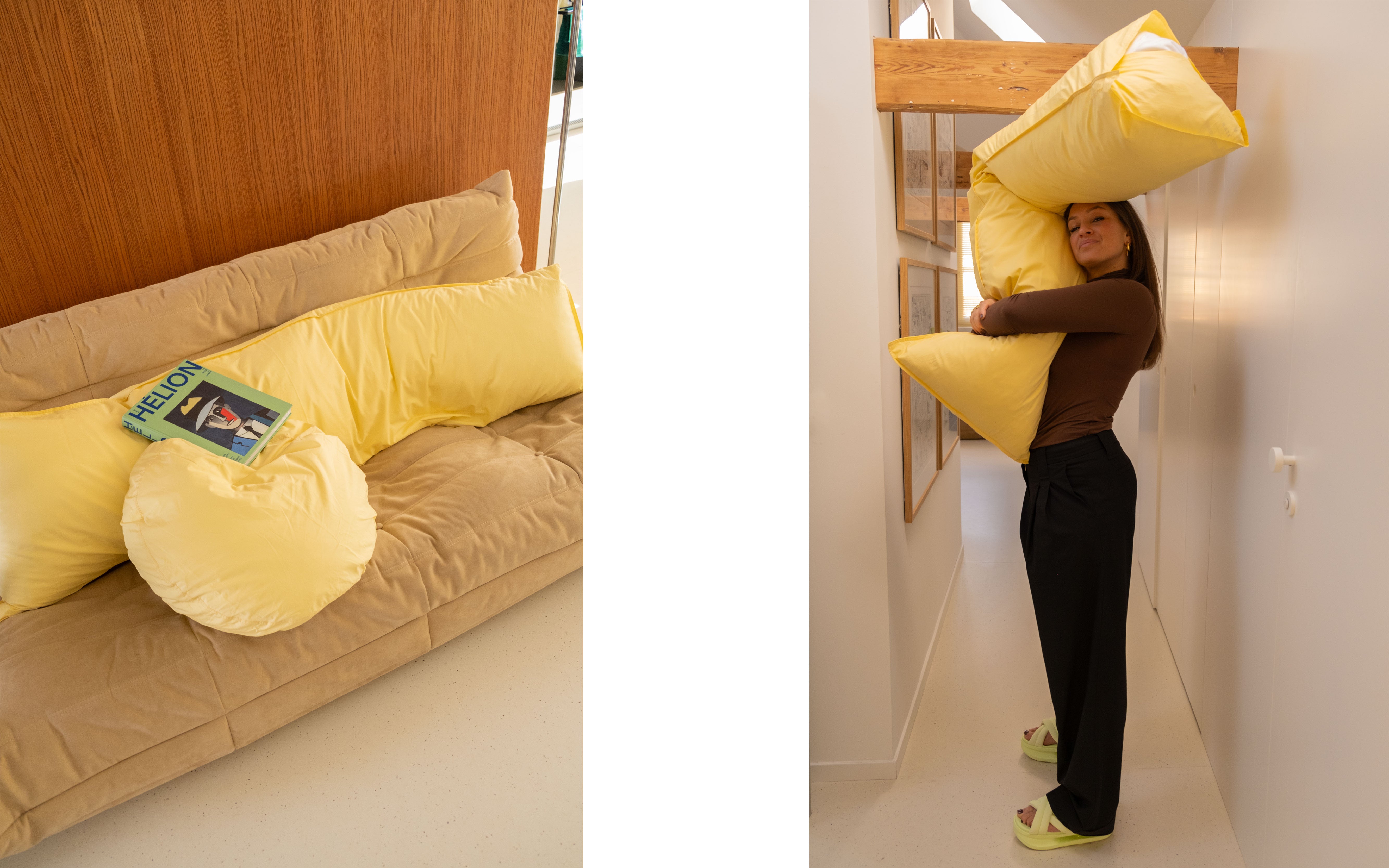 De bedMATE is het meest iconische item in onze collectie. Het extra lange kussen dient als headboard, maar ook als knuffelmaatje, een vriend die steun geeft.