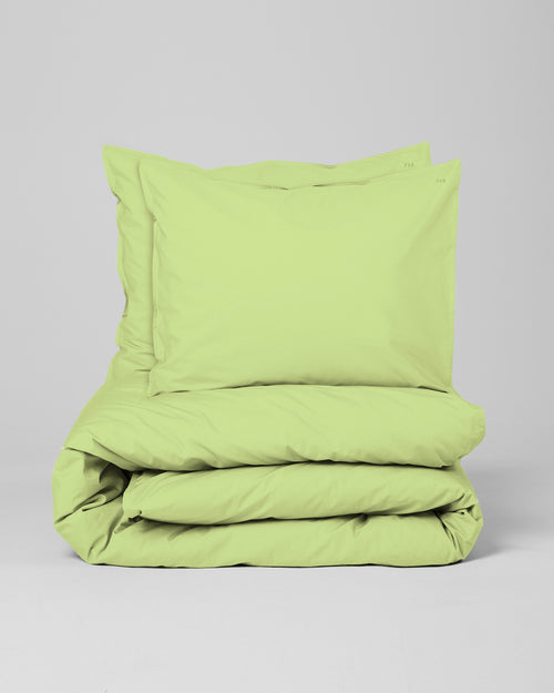 Dit licht groene luxe beddengoed van biologisch percale katoen heeft een draaddichtheid (threadcount) van 300. Percale katoen is heerlijk glad en krakerig crispy. Dekbedovertrek heeft een blinde sluiting met knoopjes zonder instop strook. Een set bestaat uit een dekbedovertrek met 1 of 2 kussenslopen.