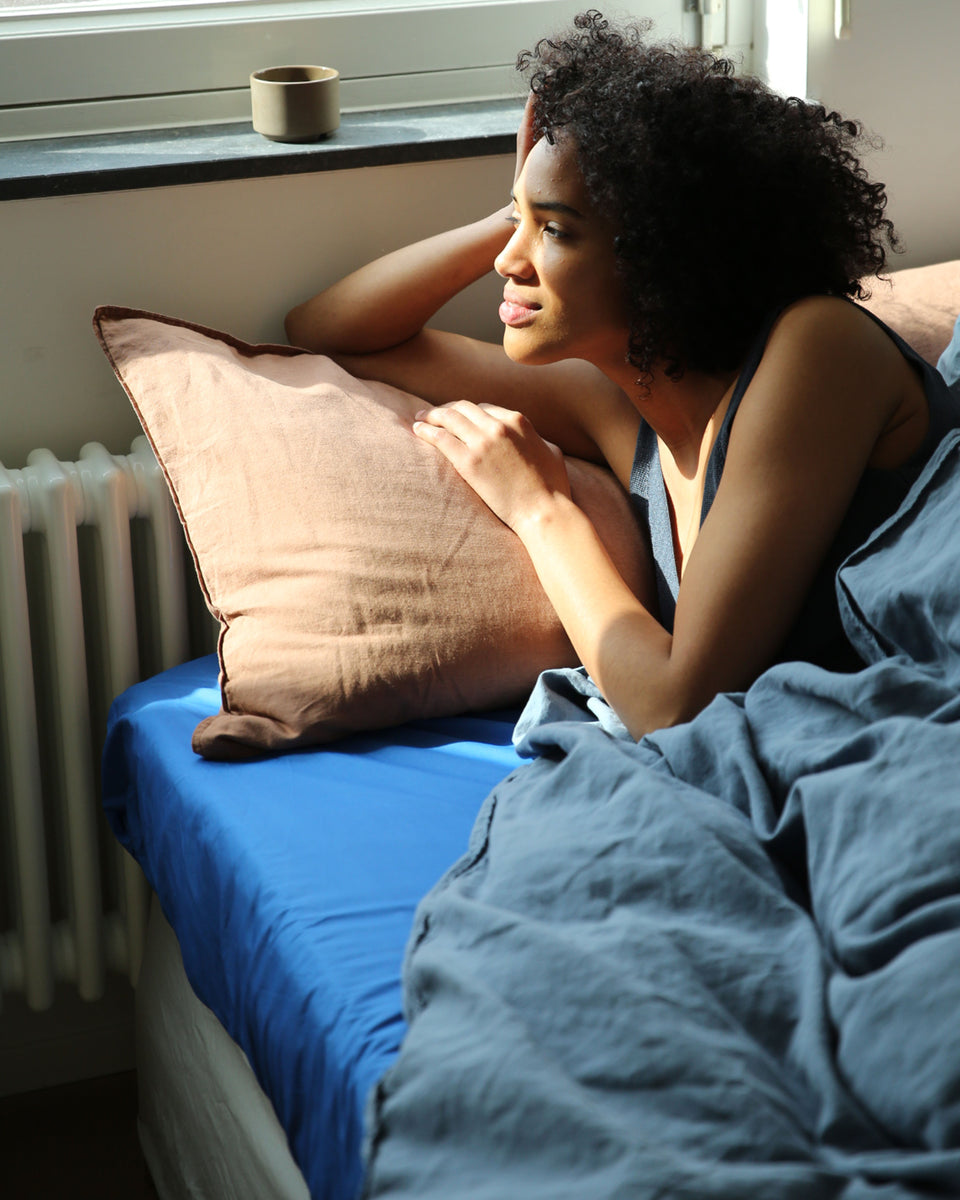 Kobalt blauw hoeslaken van biologisch percale katoen ademt goed en voelt heerlijk glad aan. Het hoeslaken heeft een 30 cm hoge rand, elastiek helemaal rondom en is daardoor ook geschikt voor om toppers. Geschikt tot een matras hoogte van 25 cm (inclusief topper).
