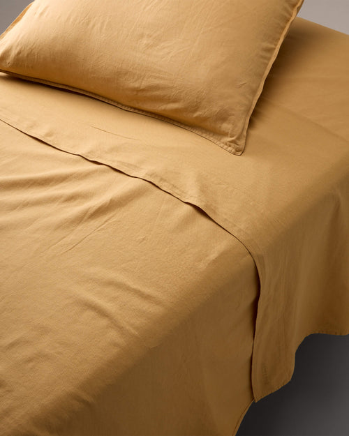 Geel gekleurd linnen laken van 55% linnen en 45% katoen, ademt goed. Heeft een iets grover mat geweven textuur. Dankzij de toevoeging van katoen zijn onze linnen lakens zachter dan de 100% linnen lakens.